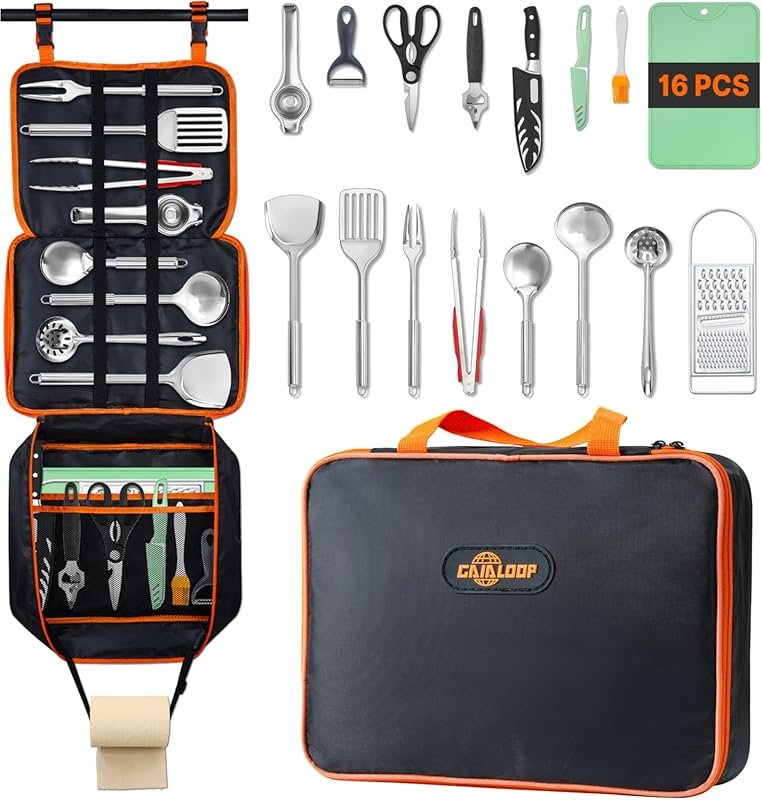 The FANGSUN portable camping kitchen set shines with its grill-focused design, offering a balanced mix of chopping, mixing, and grilling essentials. Ideal for RVers and picnickers alike, this 16-piece kit includes a meat knife, soup ladle, tongs, spatula, and even adjustable straps for hanging. Its compact size makes it easy to store in tight spaces, while the stainless steel tools resist rust and corrosion.