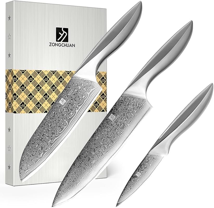 1. Damascus Chef Knife Set 3 PCS: Ultra-Sharp 9CR18MOV Steel, Ergonomic Handle, Dishwasher Safe