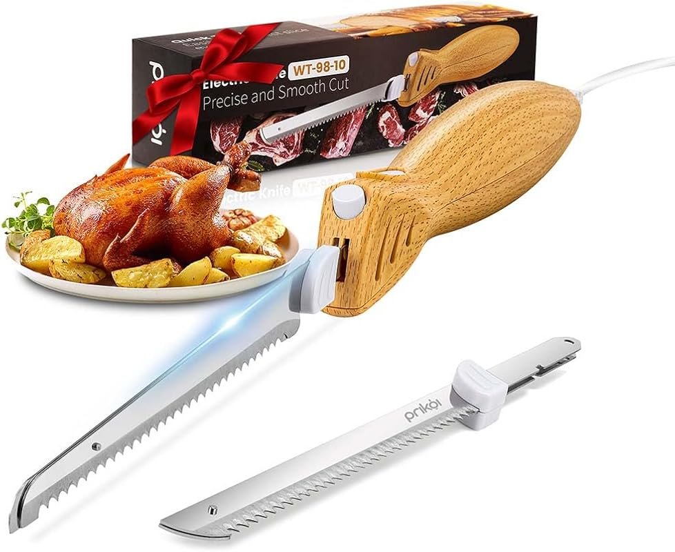1. Prikoi Electric Knife Set with Faux Wood Handle, 2 Serrated Blades for Meat, Bread & Turkey Carving