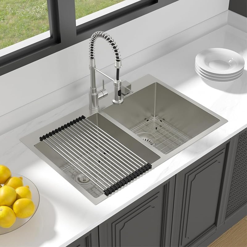 4. Rhbamoa 33×22″ T304 Stainless Steel Drop-In Double Bowl Sink, 10″ & 7″ Deep Top Mount
